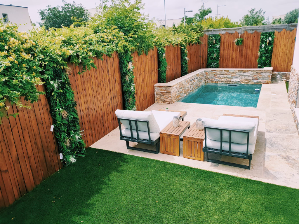 Cette piscine compacte a été réalisée avec des finitions soignées, incluant une banquette pour le confort et une lame d’eau de 80 cm pour un effet visuel moderne et apaisant. Conçue pour maximiser l’espace dans des petits jardins, cette piscine sur mesure reflète notre savoir-faire dans la création d’espaces extérieurs uniques.10m2, dimension 4×2,5m avec banquette et lame d’eau de 80 cm.