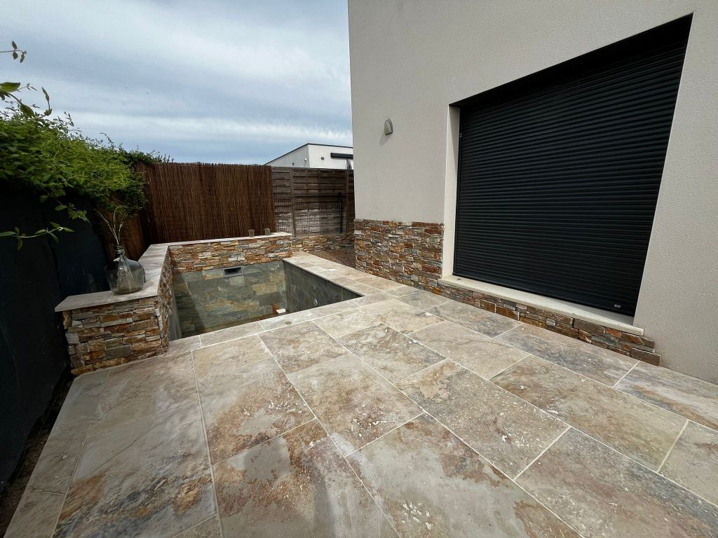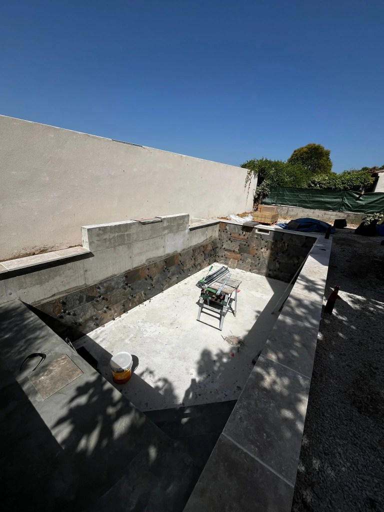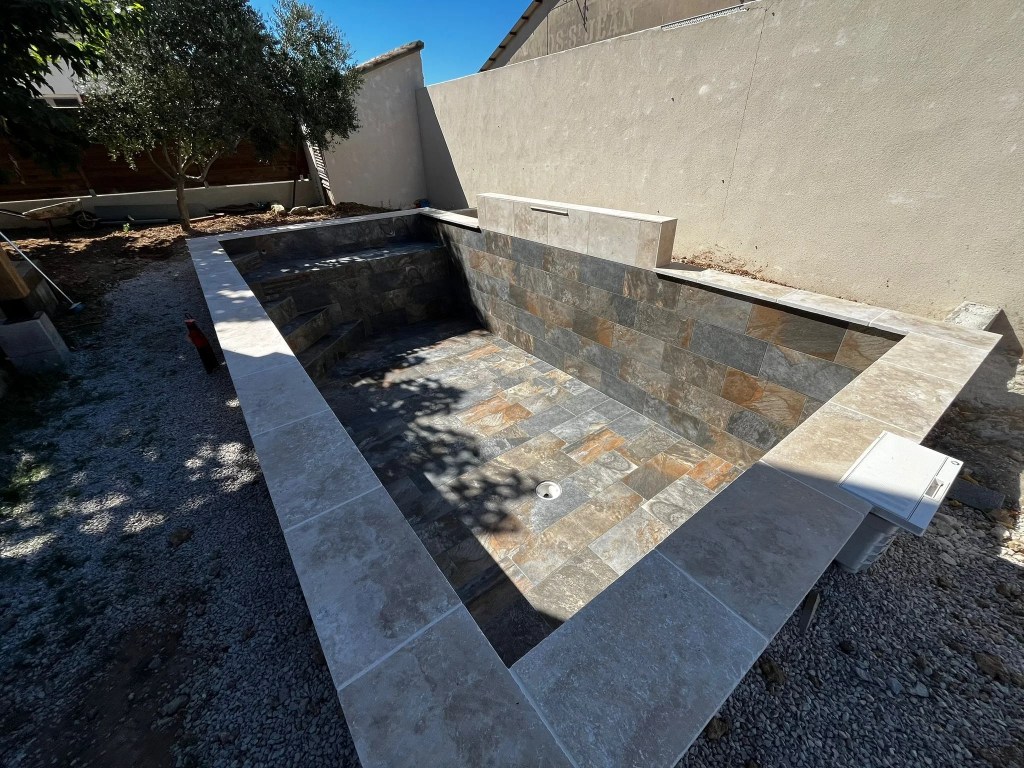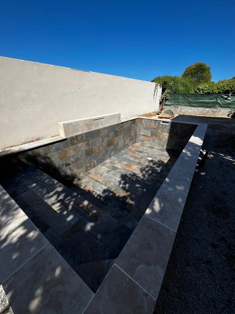 Construction d’une piscine (5x3m) avec une banquette intégrée, revêtue de carrelage 30×60 effet pierre de Bali, offrant une finition élégante et naturelle. Nous assurons chaque étape de la réalisation, de la conception à la finition, pour créer un espace de détente unique adapté à vos besoins.