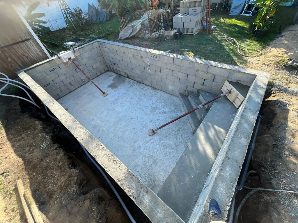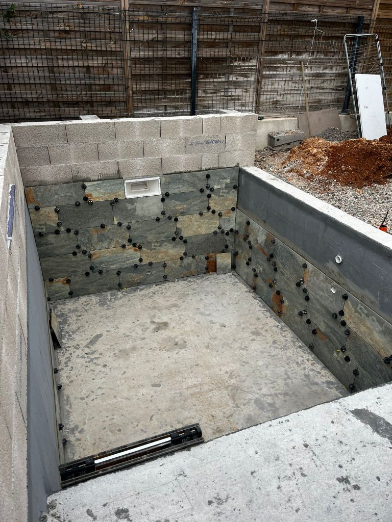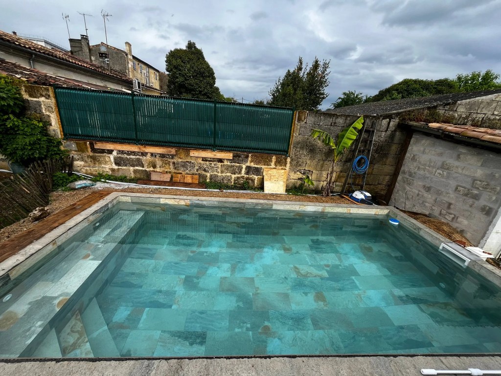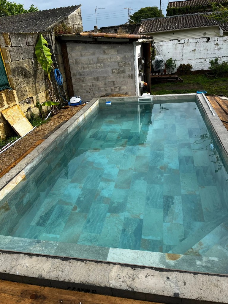 Construction d’une piscine (5x3m) avec une banquette intégrée, revêtue de carrelage 30×60 effet pierre de Bali, offrant une finition élégante et naturelle. Nous assurons chaque étape de la réalisation, de la conception à la finition, pour créer un espace de détente unique adapté à vos besoins.