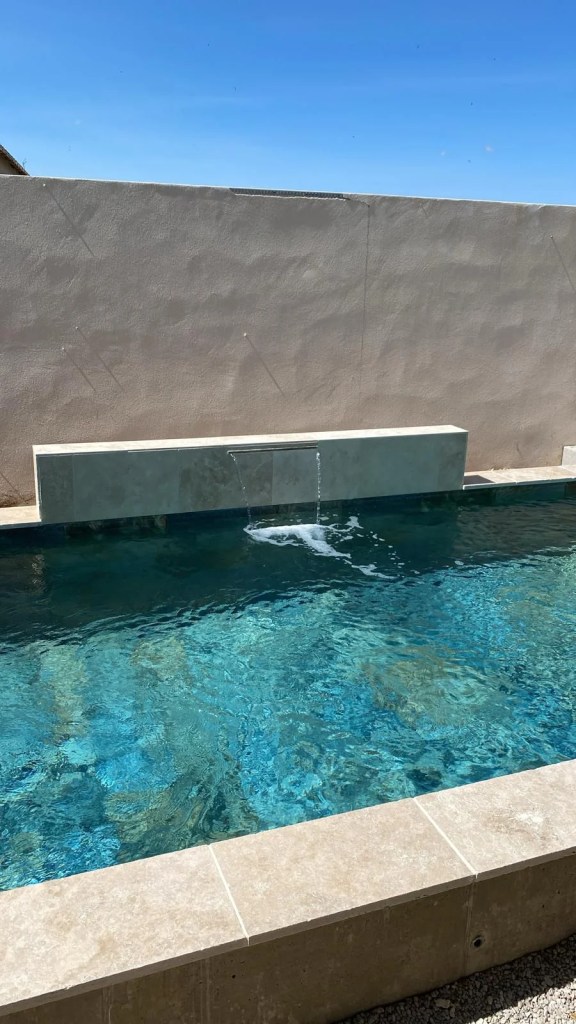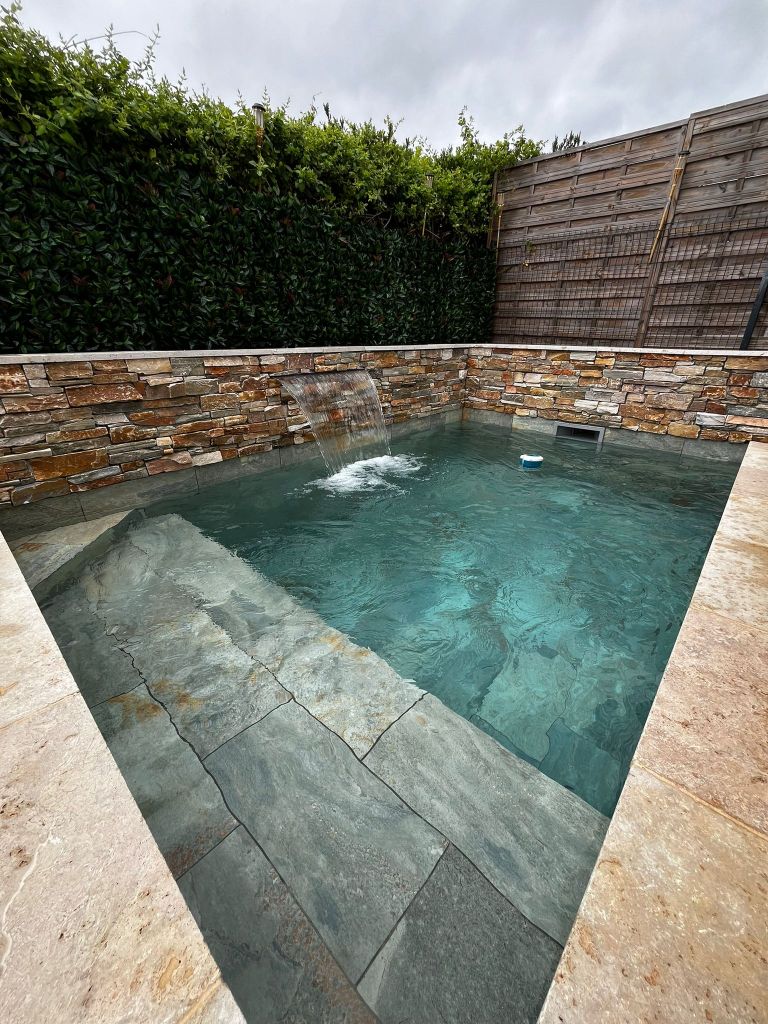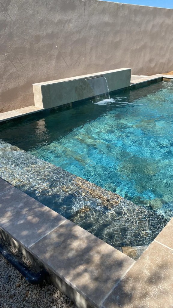 Conception d’une piscine sur mesure de 6×3 mètres avec un revêtement en carrelage Bali multicolore 30×60 pour une ambiance chaleureuse et unique. La lame d’eau en cascade ajoute une touche apaisante, tandis que les margelles en travertin apportent une finition élégante et naturelle. Parfaite pour sublimer votre espace extérieur, cette piscine allie style, relaxation et qualité.