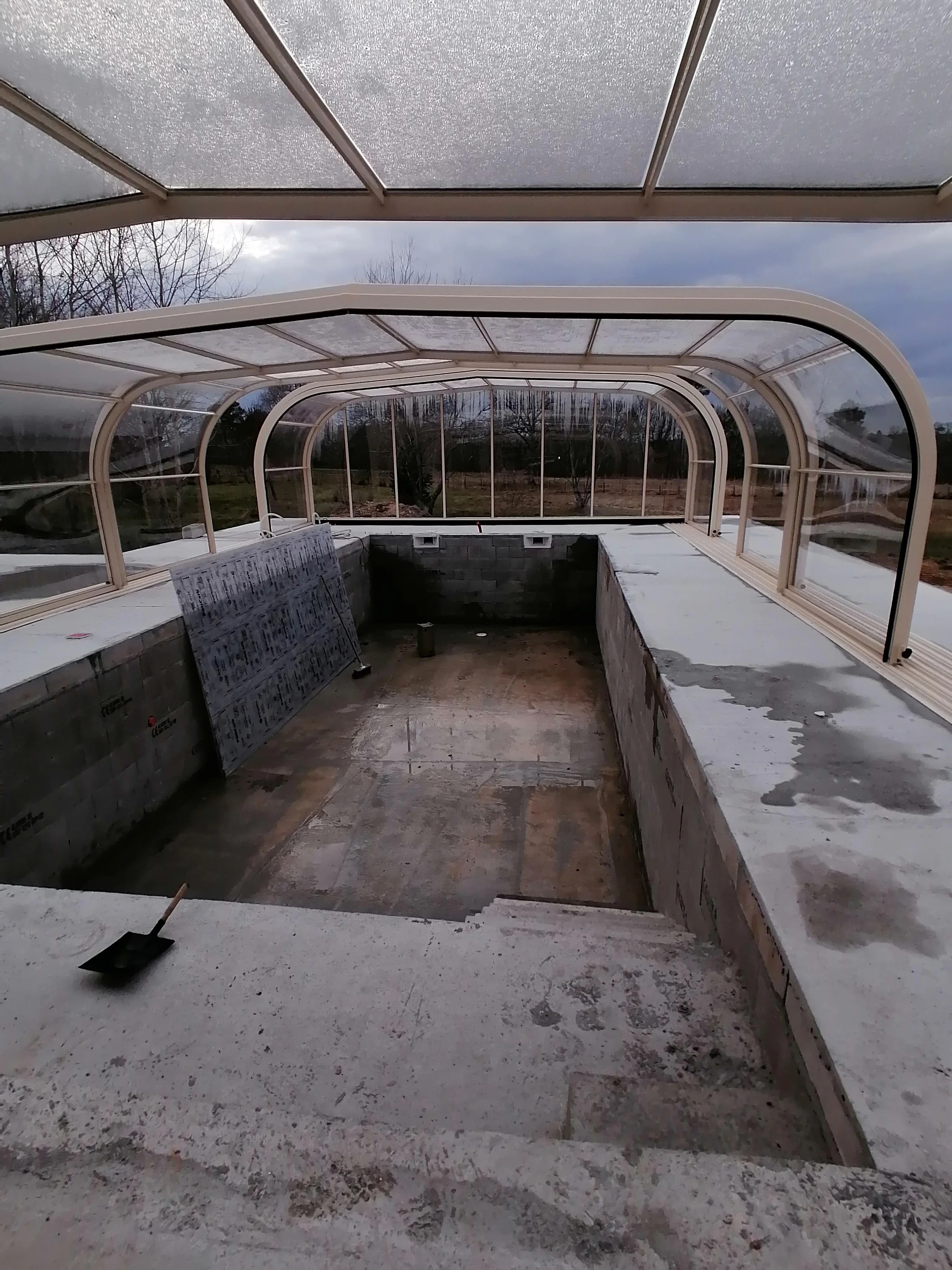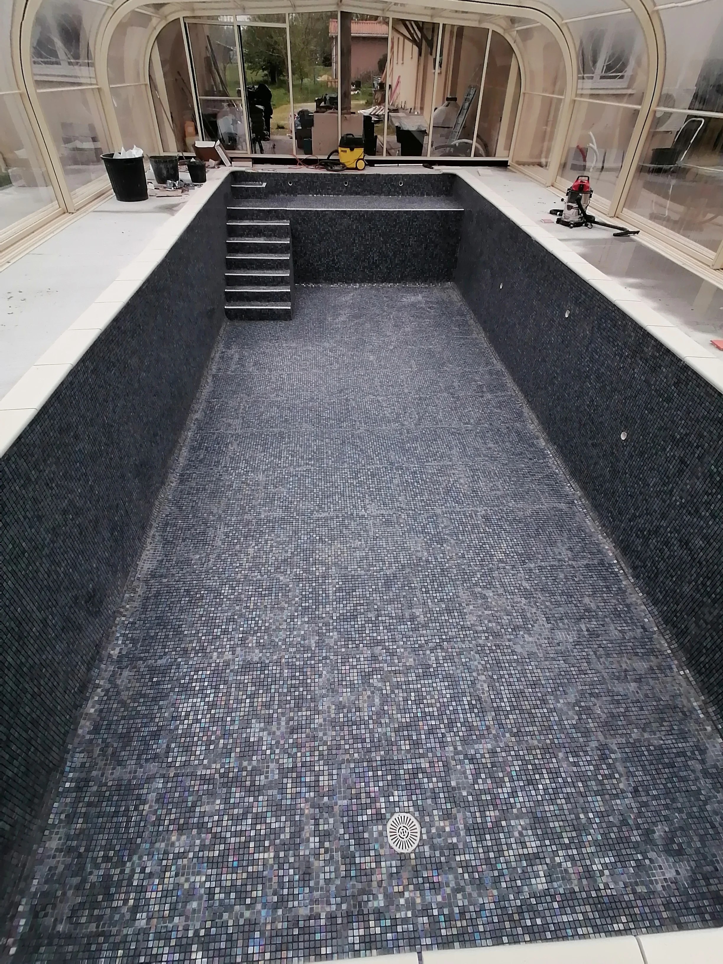 Création d’une piscine de 10x4m avec terrasse et abri sur terrain en pente : Réalisation d’une piscine sur mesure de 10×4 mètres (profondeur 1,60m) en mosaïque noire nacrée, offrant un effet visuel élégant et contemporain. Le projet comprend une terrasse de 200m² pour un espace de détente spacieux, ainsi qu’un abri de piscine manuel de 12x6m (hauteur de 2,50m) en 5 modules, idéal pour protéger et prolonger l’utilisation de la piscine. Ce chantier, réalisé sur un terrain en pente, met en valeur notre expertise dans la construction de piscines sur-mesure adaptées aux terrains complexes.